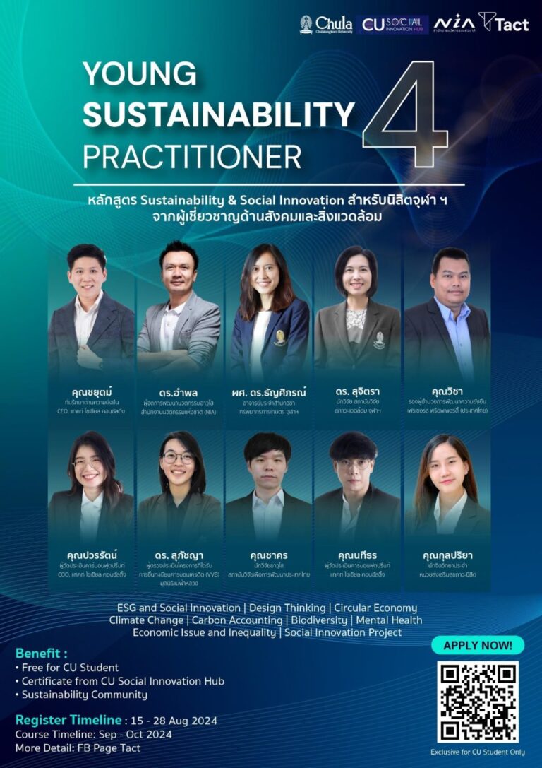 The CU Social Innovation Hub, under the supervision of the Office of Research Administration, Chulalongkorn University, has organized the Social Enterprise Incubation Program, A1 course for students: YOUNG SUSTAINABILITY PRACTITIONER #4. This program is designed for Chulalongkorn University students who wish to prepare themselves for careers in sustainability.