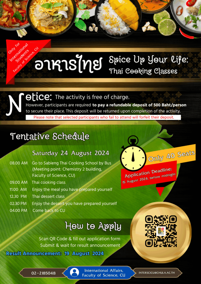 For more information, contact Mr. Khomsan Chantasena at Room 105, Chemistry Building 2, or email us at interscicu@chula.ac.th.