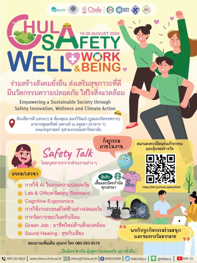 Chulalongkorn University’s Center for Safety, Occupational Health, and Environment (CSHOE) in collaboration with the Chulalongkorn University Safety, Occupational Health, and Workplace Environment Committee (CU-SHEC), the Center of Excellence on Hazardous Substance and Waste Management, the Environmental Research Institute, the Institute for Occupational Safety, Health and Environment Promotion (Public Organization), and the Safety and Health at Work Promotion Association (Thailand) under the Royal Patronage, invites you to participate in our annual Safety Week for the fiscal year 2024.